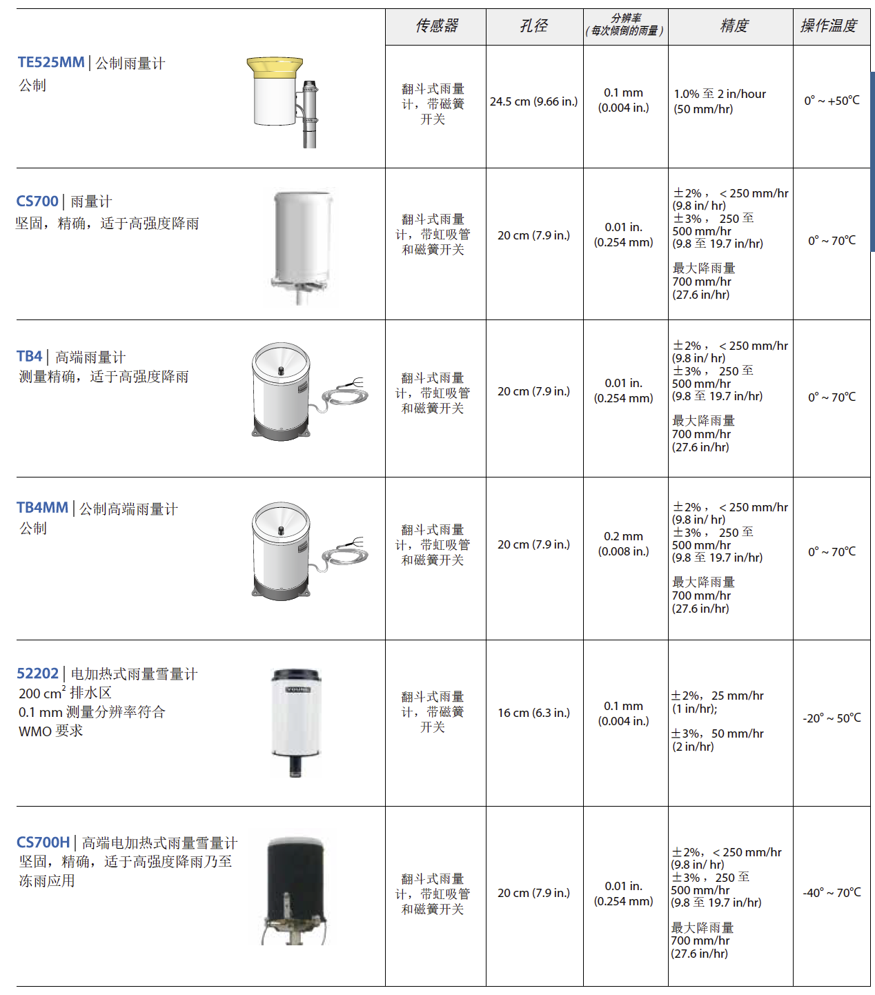 Ca mpbell Scientific 提供多种降水测量设备:翻斗式雨量计,虹吸式雨量计,加热式雨量计和降雪适配器。传感器的选择可由降水类型(雨或雪)、集雨口直径、测量量程和精度来确定。